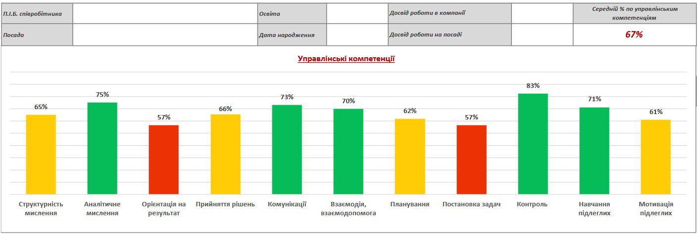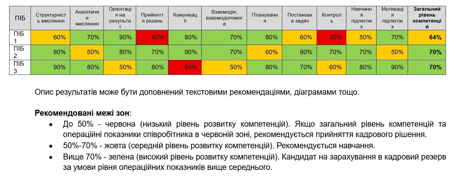 Ви отримуєте не просто звіт, а точні числові показники, які стануть надійною базою для розробки індивідуальних планів розвитку для кожного керівника та комплексних програм навчання для всієї компанії.